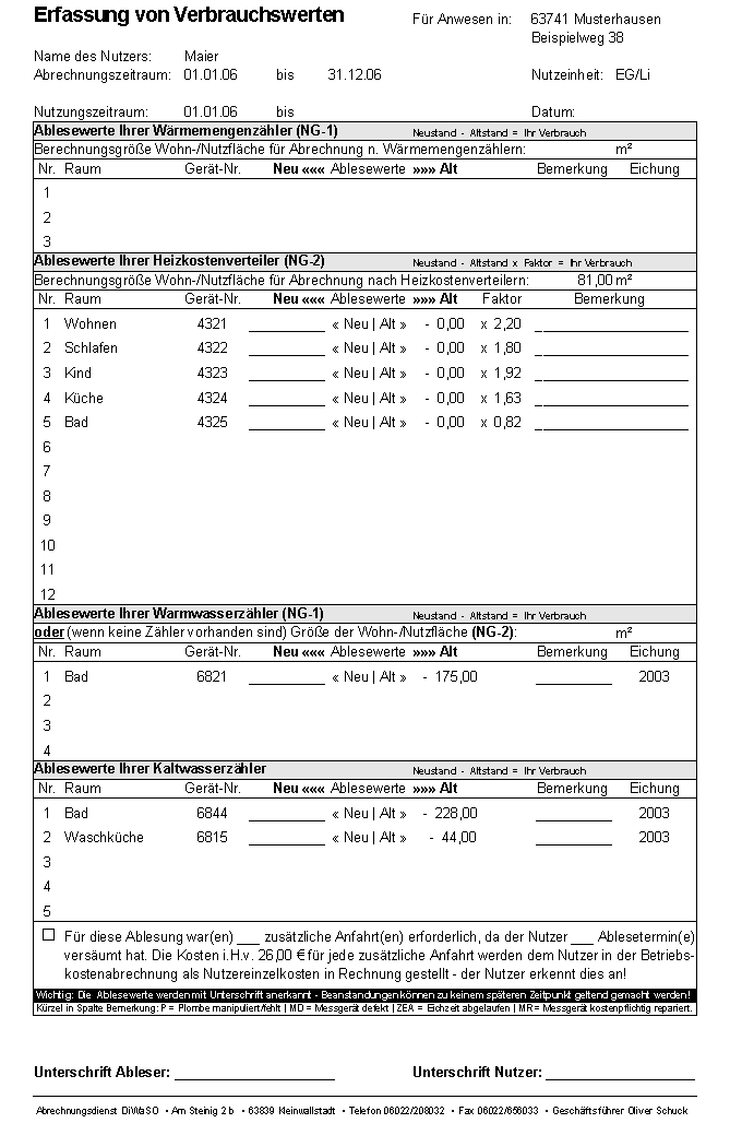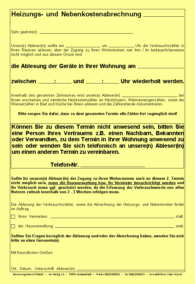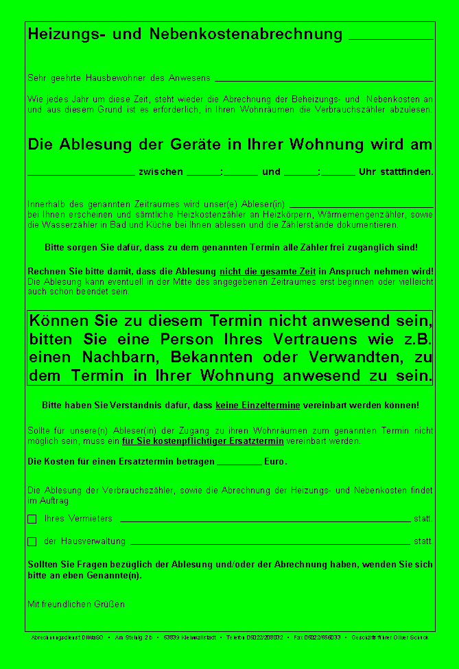Alljährliche Ablesung Hierzu gehört zunächst einmal die Bekanntmachung des Ablesetermins. Das nachfolgende Schriftstück zur Bekanntmachung wird gut sichtbar an oder in der Nähe der Haupteingangstür des Anwesens befestigt und zusätzlich jedem Nutzer in den Briefkasten eingeworfen. Alternativ versenden wir diese erste Benachrichtigung auch per Post an jeden Nutzer. Versäumt ein Nutzer diesen Ablesetermin, erhält er das nachfolgende