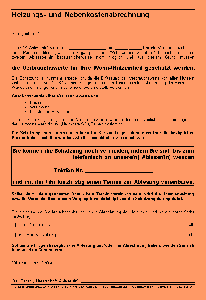 einen individuellen Termin zu vereinbaren. Versäumt ein Nutzer diesen 2. Ablesetermin, erhält er das nachfolgende Schriftstück mit der Bekanntgabe, dass die Schätzung seiner Verbrauchswerte erfolgt, wenn die Ablesung nicht kurzfristig bis zum .... erfolgen kann. Gleichzeitig werden wir Sie über den Vorgang unterrichten. Sollte die Ablesung nicht innerhalb von 4 Wochen nach dem 1.