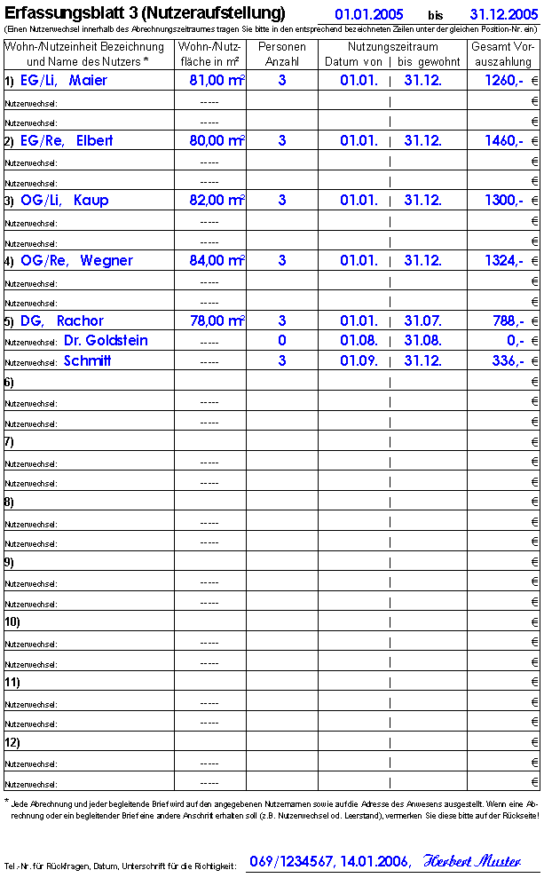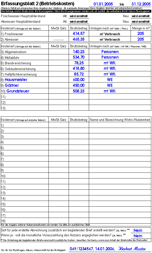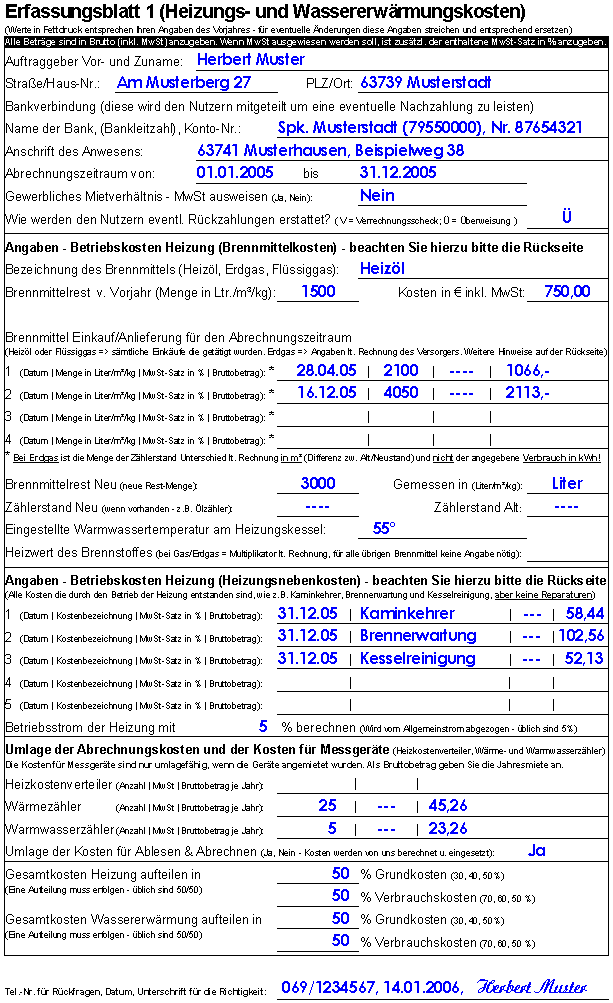 Datenerfassung Nach der Ablesung der Zählereinrichtungen erstellen wir die Heiz- und Betriebskostenabrechnung anhand der von Ihnen anzugebenden Kosten, Mengen und Nutzer. Diese Daten tragen Sie in die nachfolgenden Erfassungsblätter ein und senden uns diese zu - dies ist auch über das Internet möglich. Für die erste Abrechnung erhalten Sie die Erfassungsblätter noch blanko und das bedeutet etwas mehr Schreibarbeit, aber üblicherweise füllt der für Sie zuständige Mitarbeiter die Erfassungsblätter bereits bei Vertragsabschluss fast vollständig mit Ihnen zusammen aus. Ab der zweiten Abrechnung sind dann bereits alle Stammdaten in die Erfassungsblätter eingetragen, so das von Ihnen lediglich noch die Kosten, Mengen, Nutzer und das jeweilige Datum einzutragen ist. Wenn Sie sehen möchten, wie Sie das Kostenerfassungsblatt von eben im nächsten Jahr erhalten, dann klicken Sie bitte hier (es öffnet sich ein neues Fenster Ihres Browsers). Auf der Rückseite von Erfassungsblatt befinden sich zusätzliche Informationen - so z.B. welche Kosten umlegbar sind oder was ansonsten zu beachten ist. Um die Rückseite zu sehen klicken Sie bitte hier. Wenn Sie sehen möchten, wie Sie das Kostenerfassungsblatt von eben im nächsten Jahr erhalten, dann klicken Sie bitte hier (es öffnet sich ein neues Fenster Ihres Browsers). Wenn Sie sehen möchten, wie Sie das Kostenerfassungsblatt von eben im nächsten Jahr erhalten, dann klicken Sie bitte hier (es öffnet sich ein neues Fenster Ihres Browsers). |