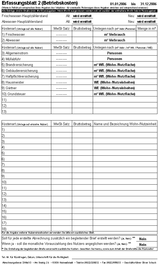 Kosten-/Nutzererfassungsblatt 2 für das nächste Jahr - hier sind bereits sämtliche Daten eingetragen, so das Sie lediglich noch Kosten, Mengen und das jeweilige Datum eintragen müssen.