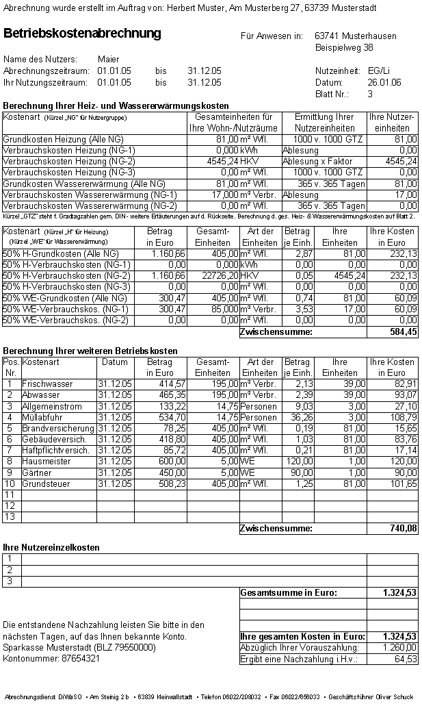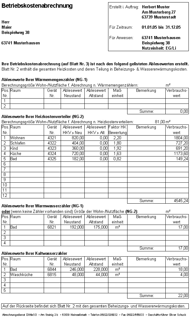 Nutzereinzelabrechnung Die Nutzereinzelabrechnungen sind die Abrechnungen, welche letztlich jeder Nutzer von Ihnen erhält. Die Einzelabrechnungen bestehen jeweils aus 4 Seiten (2 Blätter beidseitig bedruckt) und Sie erhalten diese jeweils doppelt - ein Exemplar zum weiterleiten an den Nutzer und ein Exemplar für Ihre Unterlagen. Die Einzelabrechnungen bestehen im Einzelnen aus: Blatt Nr. 1: Ablesewerte der Zählereinrichtungen
